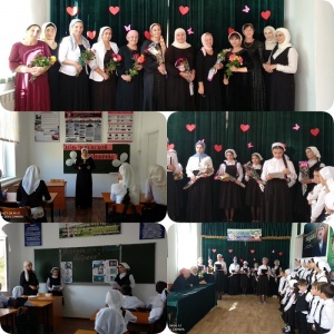Учащиеся 9-11кл. у порога встретили учителей женщин с цветами, выпустили поздравительные газеты и поздравили с Днем чеченской женщины.