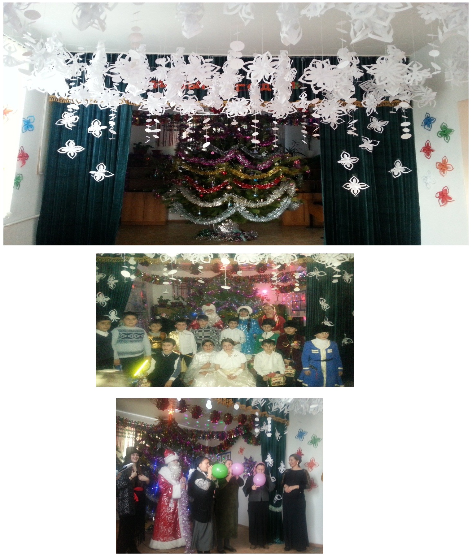 Зал был по настоящему празднично украшен ,пышная, сверкающая и искрящая елка, полная игрушек и гирлянд, мишуры, бегающих огоньков и сияющей звезды.С 29 по 30 декабря в школе были проведены новогодние праздничные мероприятия.Почти месяц учителя и учащиеся готовились к встрече Нового года: писали сценарии, подбирали музыку, шили костюмы, ставили номера с детьми. И вот, елки состоялись.Сценарий мероприятия был подготовлен зам.дир. по ВР Джанаевой М.А.. и организатором Расуевой Т.В. Также был составлен график дежурства учителей и техперсонала.Все дежурные следили за порядком в помещении. Для осуществления сценария были задействованы учащиеся 9-11классов: Насуханова Хава (Снегурочка), Каримова Танзила (Пиратка), Басханов Ислам (дед Мороз) , Дасаева Танзила (ведущая), и Ахмаева Седа (Белоснежка). и.т.д. Для младших учащихся мы подготовили новогоднюю сказку с участием Деда Мороза и Снегурочки. Дети, пришедшие на праздник, сразу узнавали героев мультфильмов: Мишка Гумми, пирата и других героев, которые помогали Деду Морозу и Снегурочке приехать к детям на Елку. Для детей среднего возраста тоже подготовили новогоднее представление, «Белоснежка и семь гномов». Ребята под руководством классных руководителей подготовили новогодние инсценированные песни 80-х, 90-х, 2-х тысячных годов. Новогодние вечера прошли весело, интересно, а в заключение всех ждала праздничная зажигательная лезгинка. Для детей старшего возраста была подготовлена сценария « Новогодняя превращения». Среди родителей тоже провели конкурс «Кто быстрее надует шар». Дети поддерживали их аплодисментами. Победителям были вручены новогодние призы. Какой праздник без зажигательной лезгинки! Дети с удовольствием кружились в танце, даже не ждали, пока их пригласят, сами входили в круг. В конце праздника выбрали лучших танцоров: Журжаева Сацита,Аскиев Рамзан, Мерзоева Айзан и.т.д.Директор школы Асет Тагировна поздравила всех с наступившим Новым 2015 годом и пожелала им здоровья, успехов в учебе и благополучия в семье. Праздник прошел очень весело, дети и родители были довольны. Оздиева Разита от имени родителей и детей поблагодарила организаторов праздника. Были организованы конкурсы рисунков, стенгазет, стихов на тему «Зимушка - зима», устный журнал «Здравствуй, зима»,Новогодняя экологическая викторина «Что ты знаешь о зиме?». (5-7 классы), «Я здоровье берегу – сам себе я помогу».(8-11 классы).Необходимо назвать классных руководителей, чьи ученики приняли самое активное участие в общешкольных мероприятиях. Это все учителя начального звена, а также Дункаева Е.М.,Расуханова .Т. , Тайхаева З.М., Расуева Т.В. За огромный вклад и большую активность, за помощь,поддержку и участие в новогодних елках объявляется благодарность всем кл.руководителям, уч-ся и участникам новогодней программы.