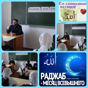 18.02.2020Педагог-организатор по ДНВиР Муцуев Ризван Нуритович провёл беседу на тему: "Раджаб и его суть" с учащимися 6 класса. Ризван рассказал что месяц Раджаб является седьмым месяцем лунного календаря. Само название «Раджаб» образовано от слова «ар-руджуб», что означает «возвеличивание». Так, именно в месяце Раджаб имели место события, известные всем мусульманам как аль-Исра и аль-Мирадж (Ночное переселение Пророка Мухаммада ﷺ из Мекки в Иерусалим и оттуда вознесение на небеса). Месяц Раджаб ещё называют Раджабом Музара, в честь одного из предков Пророка ﷺ , потому что именно его племя не смещало этот месяц, в отличие от других арабов, которые, не желая останавливать войну, переносили Раджаб на другой месяц. Месяц Раджаб является одним из священных, запретных месяцев. Школьники активно задавали вопросы по теме беседы и получали на них исчерпывающие ответы.