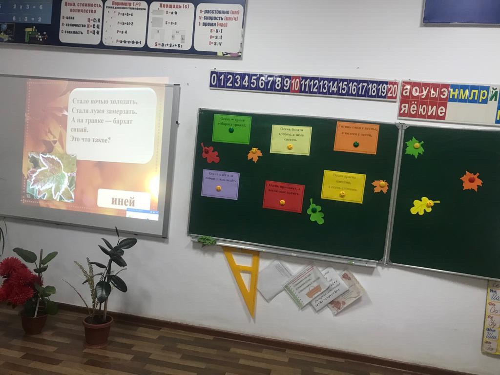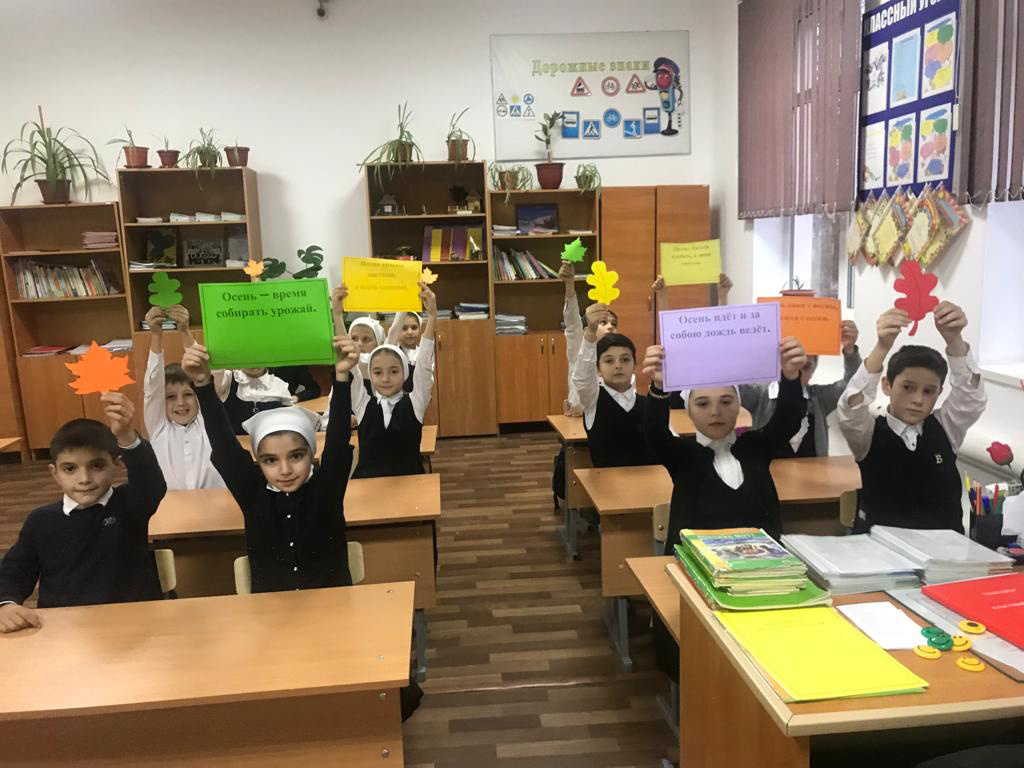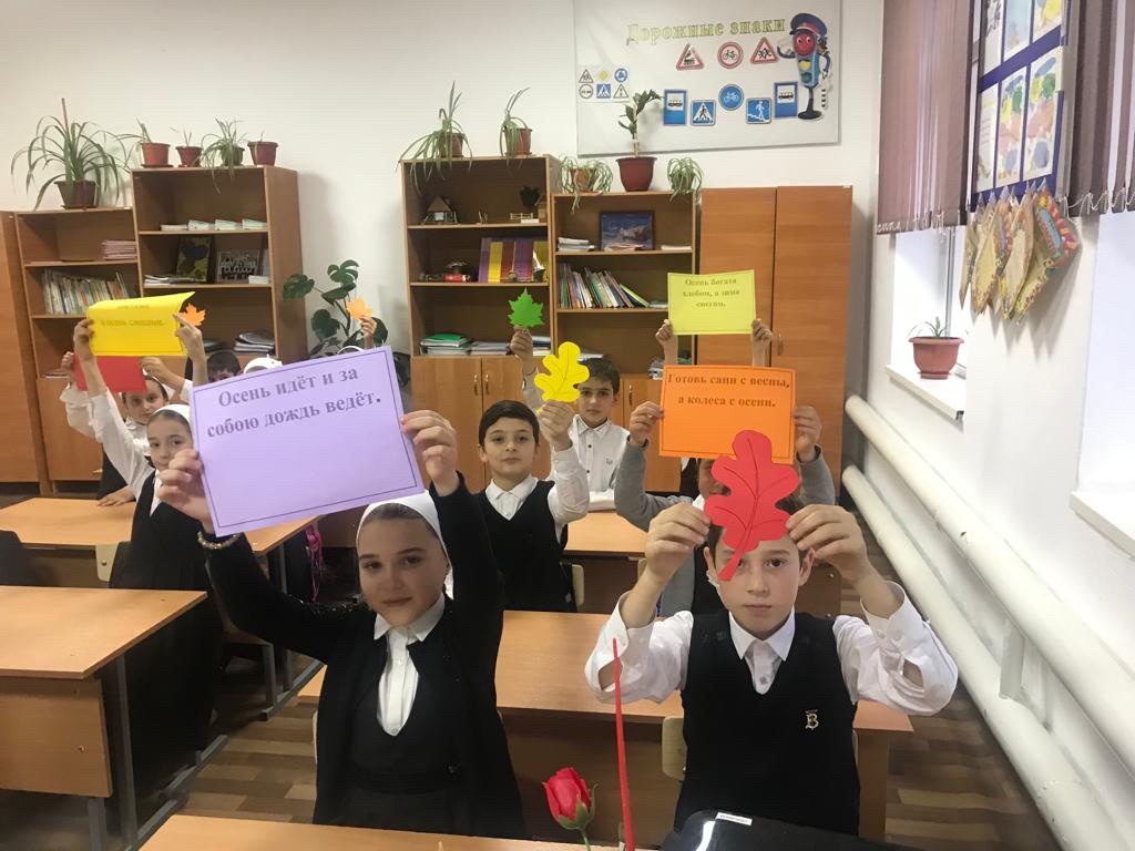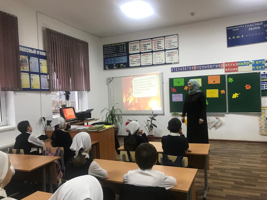 В 3-м классе МБОУ «СОШ с.п.Калаус» прошёл классный час «Здравствуй, осень!» Цель: формирование экологической культуры младших школьников; воспитание бережного отношения к природе.