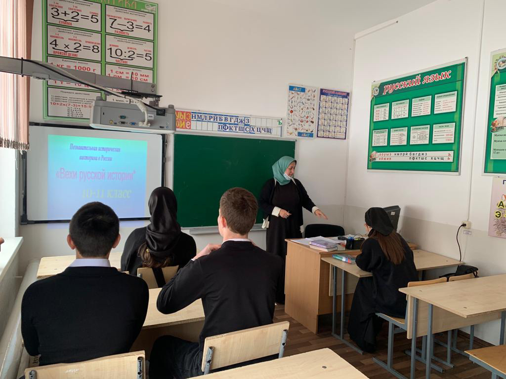 В рамках недели географии, истории и обществознания учитель истории Дункаева З.В. провела познавательно историческую викторину "Вехи русской истории" в 11 классе. Цель проведения: повторение и обобщение пройденного материала, развитие умения формулирования и конкретизации ответов на вопросы; воспитание объективности в самооценки, стремления самоутверждения личности