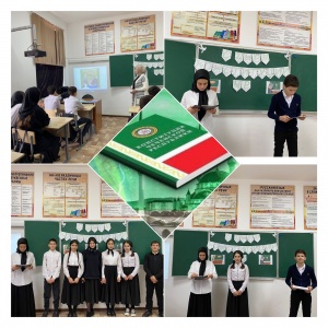 Кл.руководитель Расуева З.Д. провела в 7 классе мероприятие,посвященное Дню Конституции ЧР. Цель:сформировать понятия «закон,порядок,право»; дать представление о Конституции ЧР; ознакомить учащихся с символикой: флагом,гербом,гимном; воспитывать гордость за свою республику.