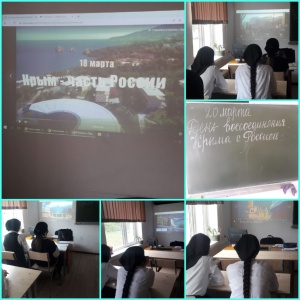 20.03.2023г. кл.руководитель 9-го класса МБОУ"СОШ с.п.Калаус"Расуева Сацита Асрульдиевна провела в своем классе кл.ч. на тему"День восс оединения Крыма с Россией"