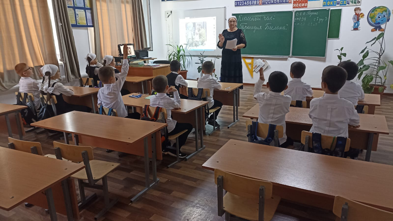 В целях формирования у учащихся толерантности, развивая сострадание и соучастие к жертвам терроризма кл руководитель 2 класса Исмаилова Л.Л. провела кл.час "Трагедия Беслана"
