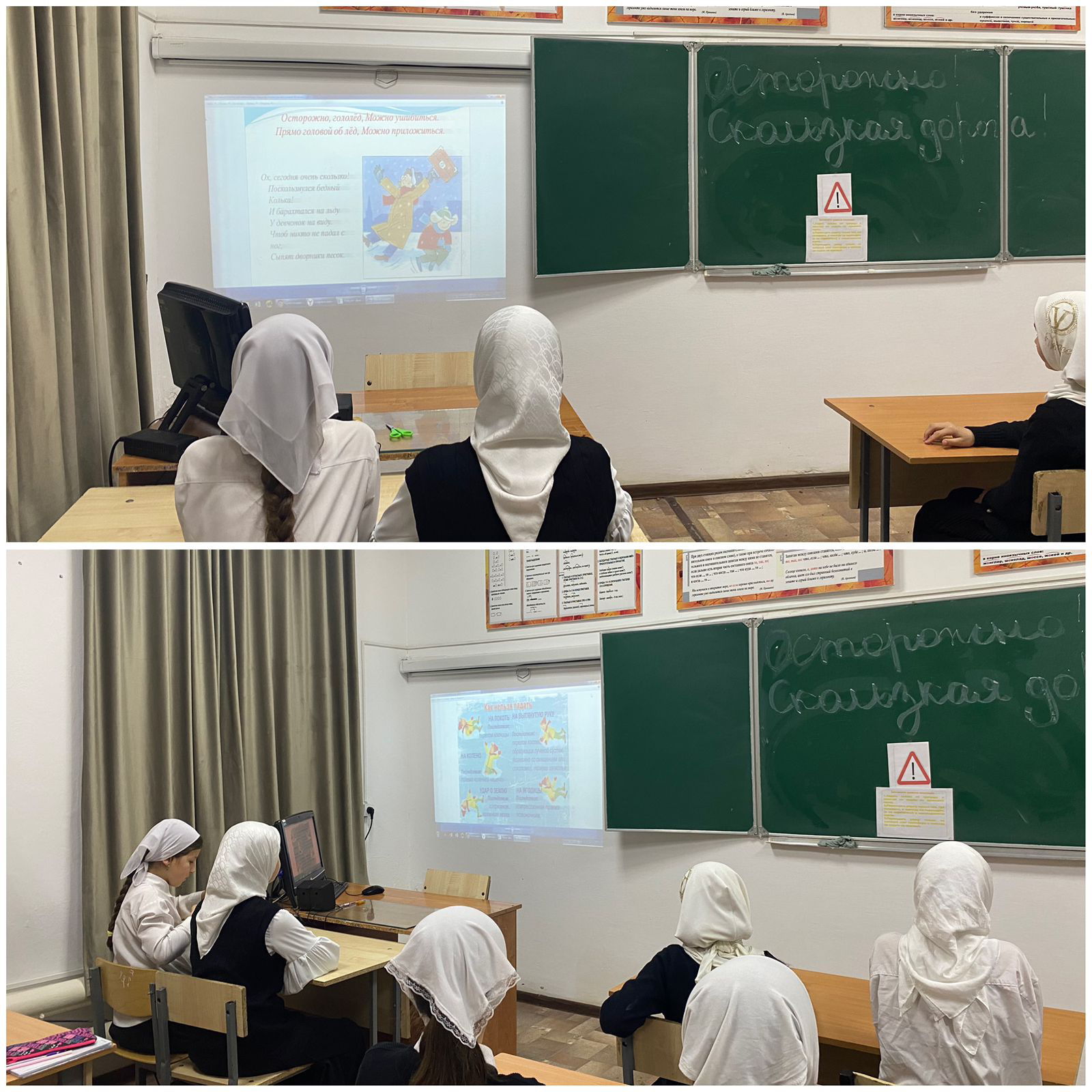Классный руководитель 5 класса провела классный час на тему «Осторожно! Скользкая дорога!». Цель: уточнить и расширить представления детей о природном явлении гололед, закрепить правила безопасного поведения в гололед.Продолжать формировать навыки безопасности, учить беречься от падения в гололед, подчиняться правилам безопасного поведения, уметь предвидеть опасность. Развивать быстроту мышления, наблюдательность, связанную речь.