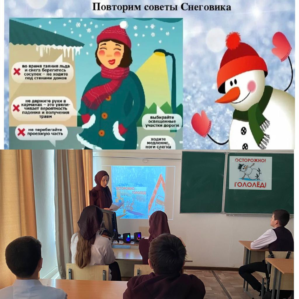 Классный руководитель 8 класса Мутакаева И.Р. провела классный час «Осторожно! Скользкая дорога!» Цель: Познакомить учащихся с правилами безопасного поведения в гололед.