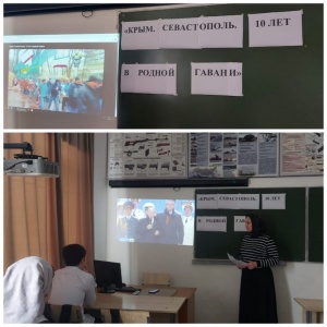 В целях формирования таких ценностей как: патриотизм,любовь к Родине,служение Отечеству и воспитания чувства гражданственности,любви и уважения к России в 9 классе МБОУ "СОШ с.п.Калаус" классным руководителем Болтукаевой Е.М. было проведено внеурочное занятие: "КРЫМ И СЕВАСТОПОЛЬ.10 ЛЕТ В РОДНОЙ ГАВАНИ"