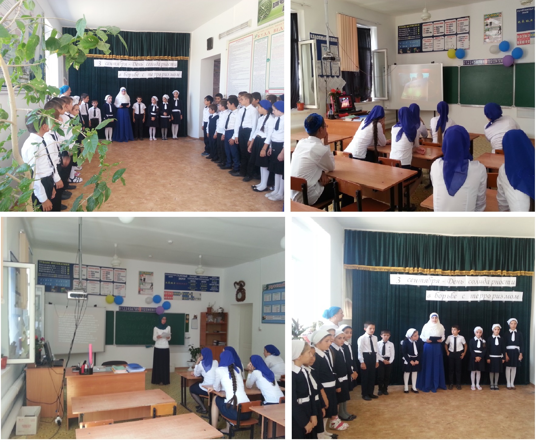 3 сентября - День солидарности в борьбе с терроризмом. Этот день приурочен к трагическим событиям, произошедшим в первые сентябрьские дни 2004 года в г. Беслане. Тогда, во время террористического акта, погибли несколько сотен человек, большинство из которых были дети. 3 сентября в МБОУ «СОШ с.п.Калаус» прошёл День солидарности в борьбе с терроризмом. Эта новая памятная дата России, установленная федеральным законом «О днях воинской славы России» от 6 июля 2005 года. Она связана с трагическими событиями в Беслане. Важно помнить, что с терроризмом следует не только и не столько бороться, сколько предупреждать его возникновение. С этой целью во всех классах в рамках учебных предметов и внеклассных занятий были проведены различные мероприятия, посвящённые памятной дате. Школьники стали участниками тематических классных часов, на которых познакомились с причинами возникновения терроризма и способами его предотвращения.Общешкольная линейка посвященная «Памяти жертв Беслана». На этой линейке выступила директор школы А.Т.Хажмурадова и педагог-организатор по ДНВР Муцуев Р.Н. в частности они подчеркнули: Сегодня мы едины в своем намерении всеми силами противостоять терроризму, как национальному, так и международному, не допустить разрастания этого преступного безумия. В наших собственных силах обезопасить себя и окружающих!Кл. часы и беседы:«Правила и порядок поведения при угрозе и осуществлении террористических актов»- Мерзуев А. А. учитель ОБЖ;«Поведение в экстремальных ситуациях»-Мерзуев А.А. учитель ОБЖ; «Дорога к миру»- 3-4кл.(Ильясова Б.С.,Дункаева Я.М.);«Трагедия в Беслане»- 9кл.(Расуева Т.В.); «Мы против терроризма»-10кл..(Дункаева Е.В.); Ребята внимательно вглядывались в слайды презентаций «Современный терроризм. Его характерные черты и особенности», на которых были изображены их сверстники с ужасом и болью в глазах.Показ видеоролика, особенно подчеркнул мысль о том, что весь мир должен объединиться в борьбе с жестокостью и терроризмом. Ведь чужой беды не бывает, горе не имеет национальных и религиозных различий.Сегодня мы едины в своем намерении всеми силами противостоять терроризму, как национальному, так и международному, не допустить разрастания этого преступного безумия. В наших собственных силах обезопасить себя и окружающих!